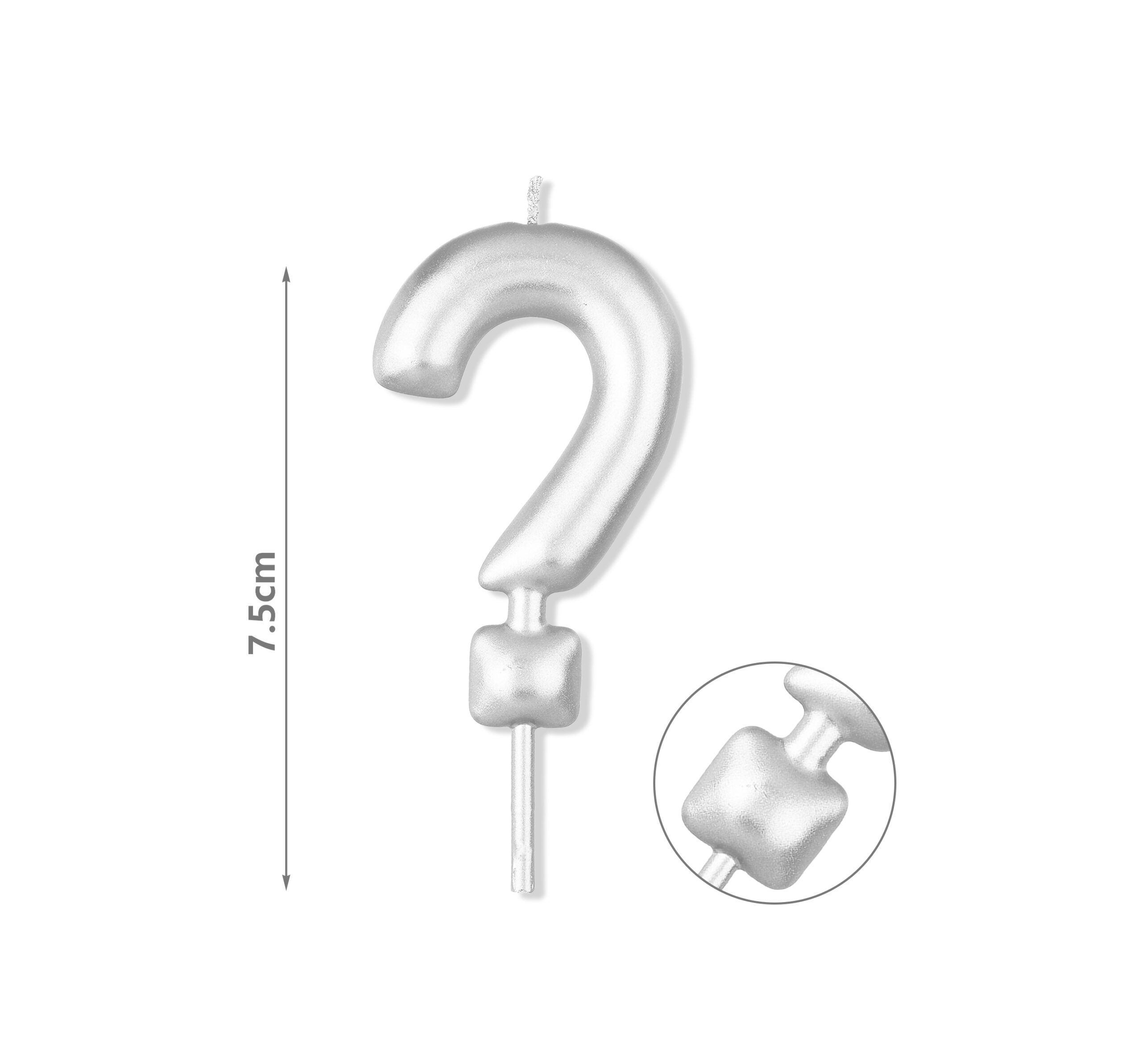 Το κερί με σύμβολο ερωτηματικού, διαστάσεων 7,5 εκατοστά, είναι η ιδανική λάμψη για τις διακοσμητικές σας δημιουργίες! Με διακριτικό αριθμητικό design, προσφέρει έναν κομψό τρόπο για να διακοσμήσετε και να γιορτάσετε τις ειδικές σας στιγμές.