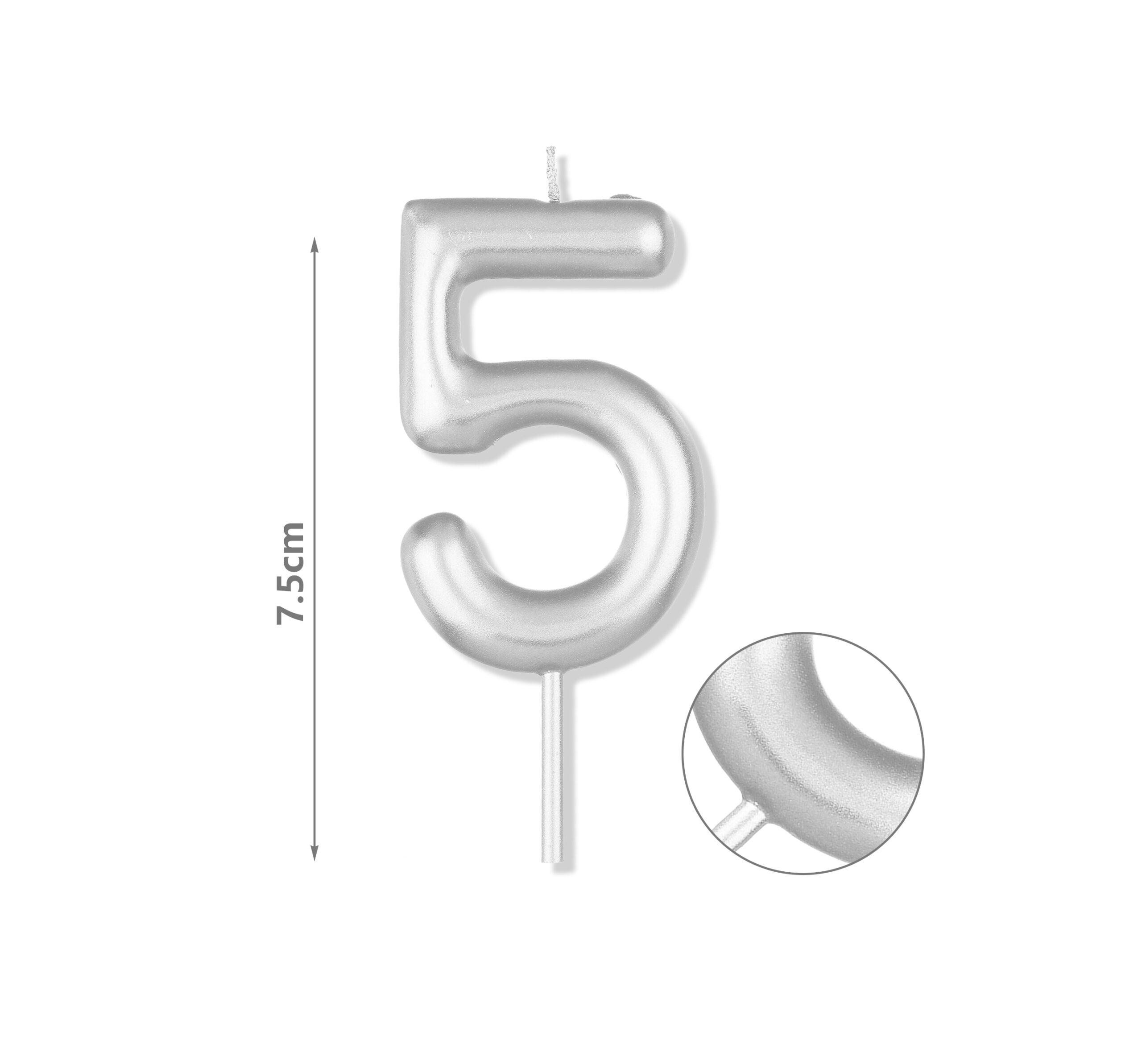 Το κερί αριθμός 5, διαστάσεων 7,5 εκατοστά, είναι η ιδανική λάμψη για τις διακοσμητικές σας δημιουργίες! Με διακριτικό αριθμητικό design, προσφέρει έναν κομψό τρόπο για να διακοσμήσετε και να γιορτάσετε τις ειδικές σας στιγμές.