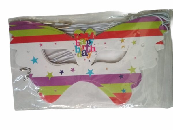 Χάρτινη μάσκα με διάφορα σχέδια και λογότυπο “happy birthday”, κατάλληλη για παιδικά πάρτυ.