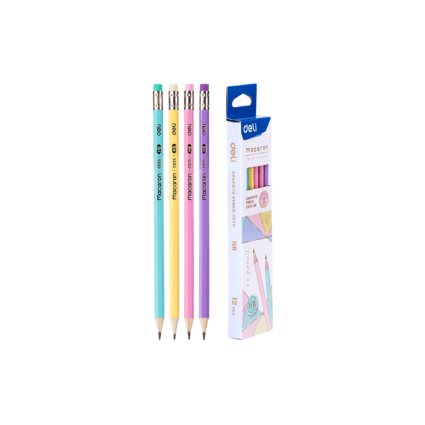 Η γραφή γίνεται παιχνίδι με το μολύβι της Deli από τη συλλογή Macaron. Το εξάγωνο εργονομικό σχήμα τους εξασφαλίζει σταθερό κράτημα και άνετη γραφή. Διαθέτει γόμα στο πίσω μέρος απαλλαγμένη από PVC ουσίες. Κατασκευασμένο από υψηλής ποιότητας ξύλο που το κάνει αρκετά μαλακό. Ακονίζεται εύκολα και έχει απαλή γραφή.