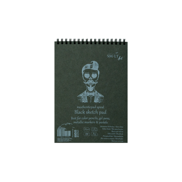 Μπλοκ σπιράλ σχεδίου SMLT Art με μαύρα ακατέργαστα φύλλα. Κατάλληλο για χρωματιστά μολύβια, στυλό gel, μεταλλικούς και παστέλ μαρκαδόρους. Τα φύλλα του μπλοκ διαθέτουν πιστοποίηση FSC. Διαθέτει εξώφυλλο από φυσικό χαρτόνι και σκληρό οπισθόφυλλο.