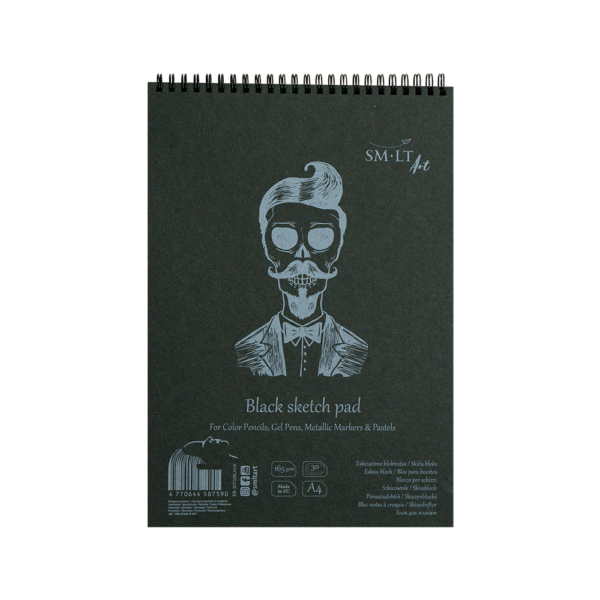 Μπλοκ σπιράλ σχεδίου SMLT Art με μαύρα ακατέργαστα φύλλα. Κατάλληλο για χρωματιστά μολύβια, στυλό gel, μεταλλικούς και παστέλ μαρκαδόρους. Τα φύλλα του μπλοκ διαθέτουν πιστοποίηση FSC. Διαθέτει εξώφυλλο από φυσικό χαρτόνι και σκληρό οπισθόφυλλο.